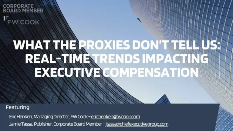 In this video, Corporate Board Member is joined by Kathryn Neel, Managing Director, Semler Brossy, who talks about “Say On Pay” and shareholder engagement on executive compensation. “Investors are asking about strategic measures. They’re asking about ESG. They’re starting to ask about non-financial drivers of success or even on the other side of that, risk factors,” Neel says.